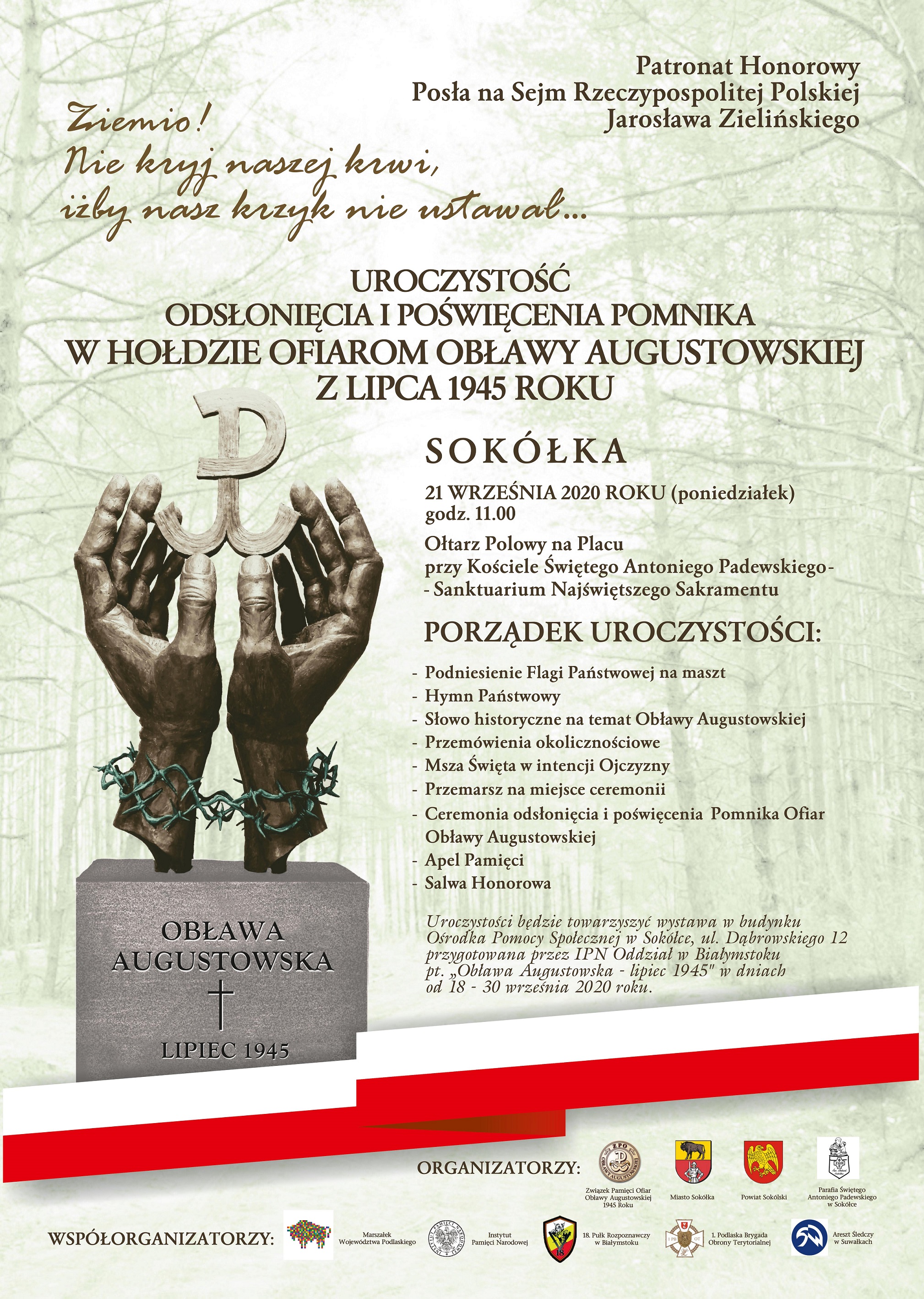 W poniedziałek, 21 września, o godz. 11.00 odbędzie się w Sokółce uroczystość poświęcenia i odsłonięcia Pomnika Ofiar Obławy Augustowskiej z Lipca 1945. Na uroczystości zaprasza poseł Jarosław Zieliński.