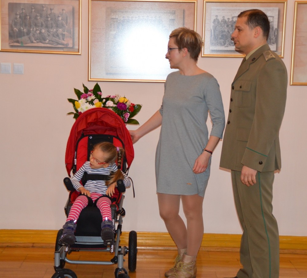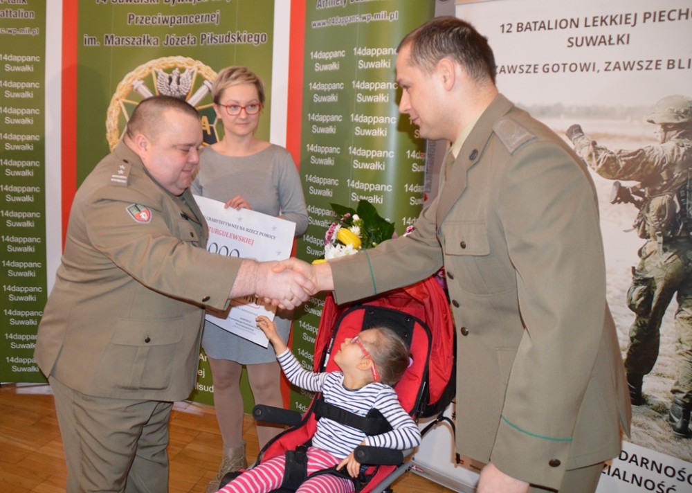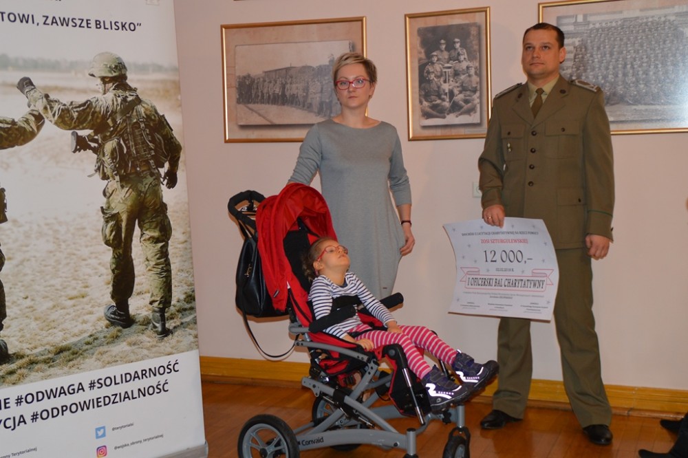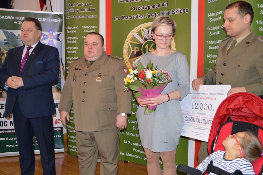 Symboliczny czek na 12 tys. zł z przeznaczeniem na leczenie i rehabilitację córki otrzymali rodzice 5-letniej Zosi Szturgulewskiej. Pieniądze pochodzą z I Oficerskiego Balu Charytatywnego Garnizonu Suwalskiego.