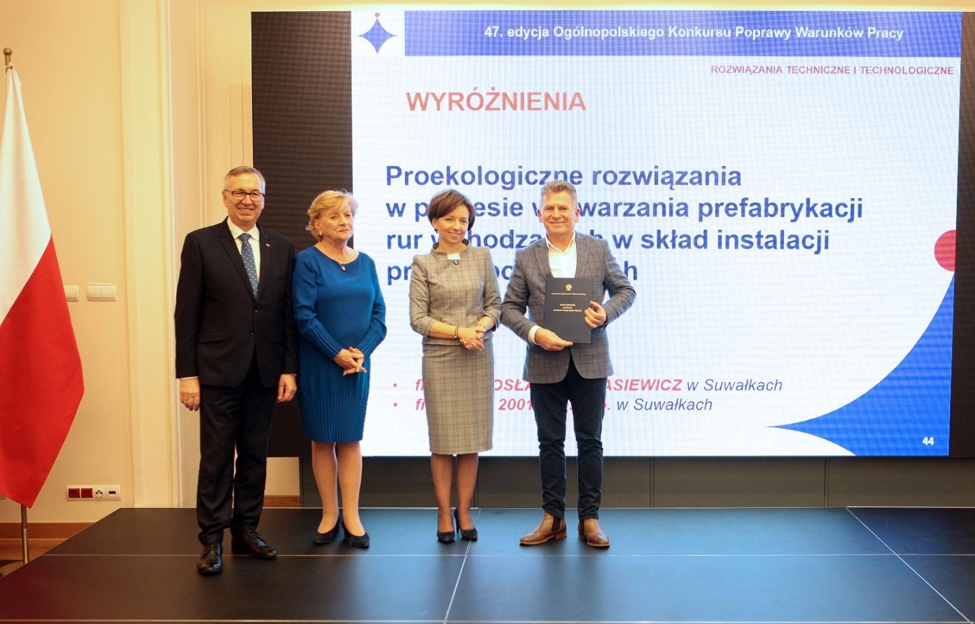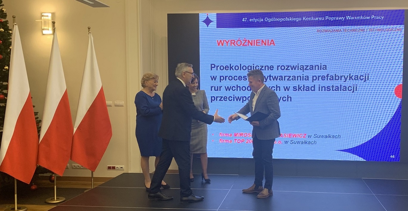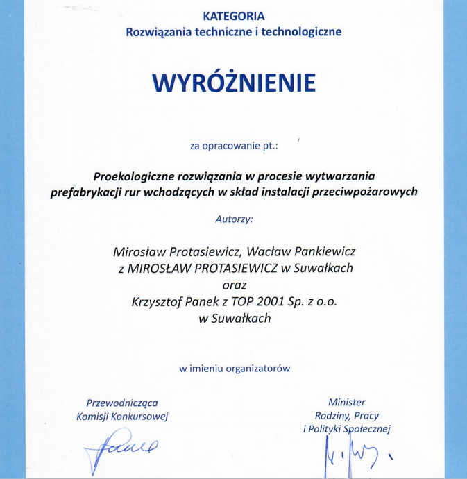 Suwalska firma otrzymaÅ‚a wyróżnienie za „Proekologiczne rozwiÄ…zania w procesie wytwarzania prefabrykacji rur wchodzÄ…cych w skÅ‚ad instalacji przeciwpożarowych”, które opracowali MirosÅ‚aw Protasiewicz i WacÅ‚aw Pankiewicz oraz Krzysztof Panek ze spóÅ‚ki TOP 2001.