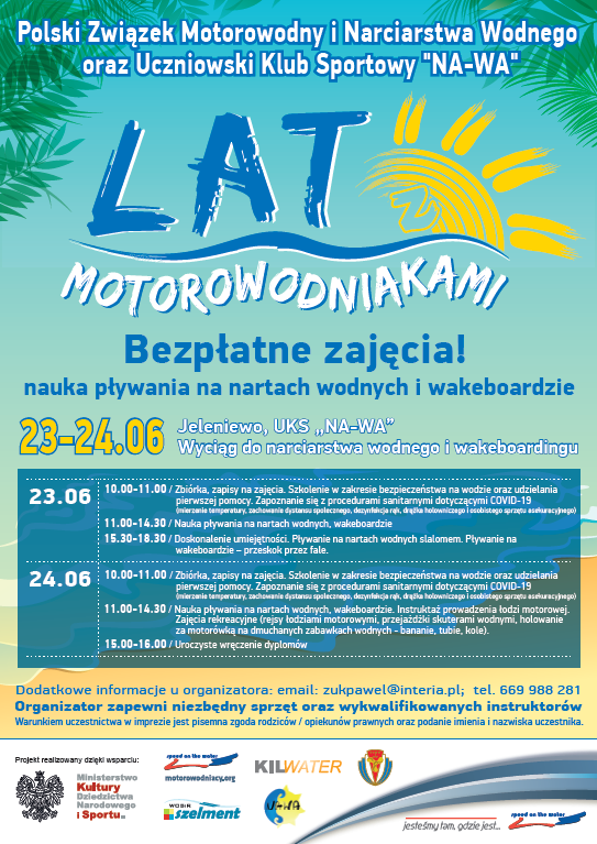 UKS NA-WA wraz z Polskim Związkiem Motorowodnym i Narciarstwa Wodnego organizuje w WOSiR Szelment darmową naukę jazdy na nartach wodnych oraz wakeboardzie dla dzieci i młodzieży ze szkół podstawowych.