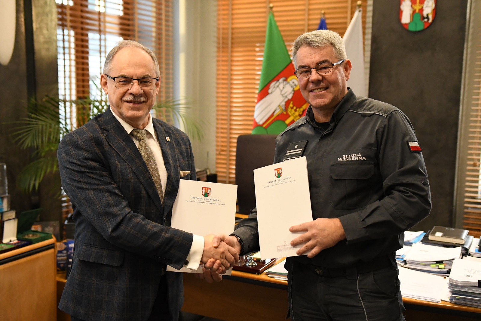 Prezydent Suwałk Czesław Renkiewicz i mjr Marek Sowulewski, dyrektor Aresztu Śledczego w Suwałkach, podpisali porozumienia o współpracy.