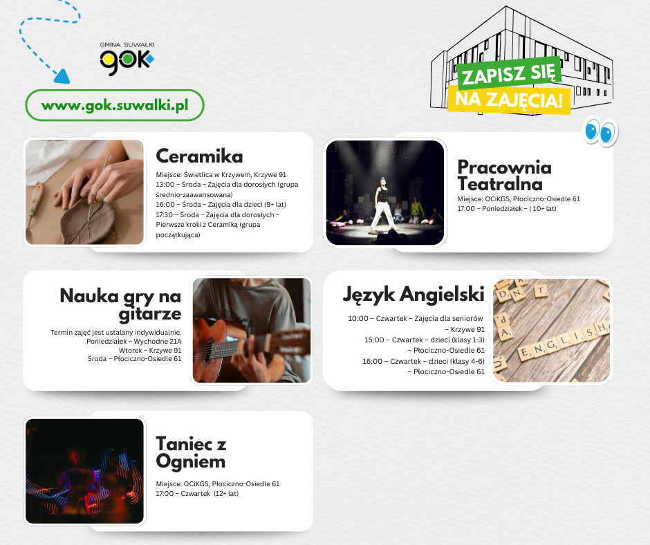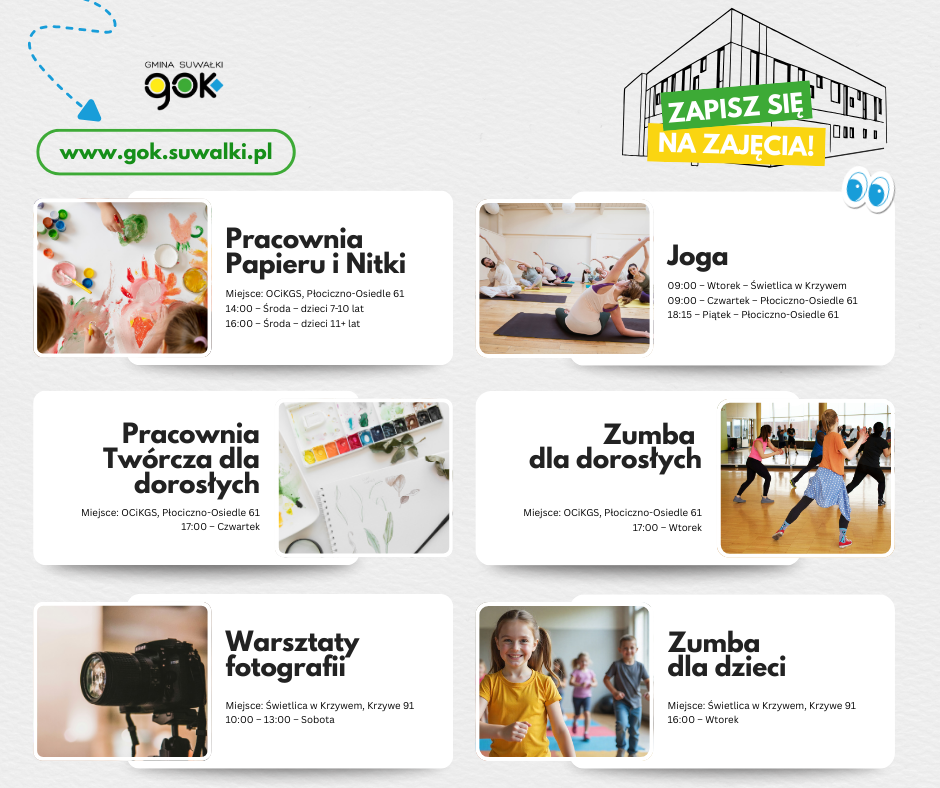 Ośrodek Czytelnictwa i Kultury Gminy Suwałki zaprasza dzieci, młodzież i dorosłych na zajęcia prowadzone w placówkach w Krzywem i Plocicznie-Osiedle.