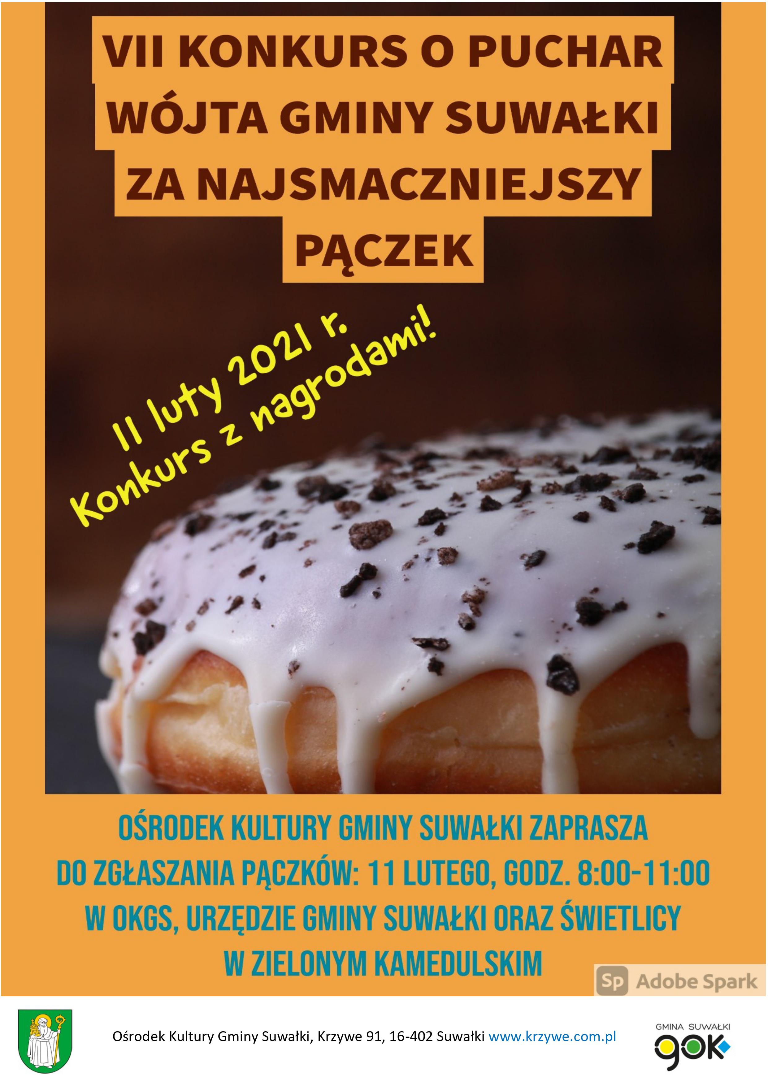 W TÅ‚usty Czwartek, 11 lutego 2021 r. nasi pracownicy bÄ™dÄ… czekali na PaÅ„stwa zgÅ‚oszenia w godzinach 8:00 – 11:00. NastÄ™pnie wszystkie pÄ…czki zostanÄ… poddane ocenie komisji konkursowej w UrzÄ™dzie Gminy SuwaÅ‚ki. Ze wzglÄ™du na pandemiÄ™ prosimy o zgÅ‚aszanie po trzy pÄ…czki (po jednym dla każdego czÅ‚onka komisji), zapakowane w foliÄ™. Niech konkurs przebiegnie bezpiecznie i sprawnie. Wyniki ogÅ‚osimy 11 lutego na naszej stronie internetowej i Facebooku, dodatkowo laureaci zostanÄ… powiadomieni telefonicznie. Zapraszamy do zapoznania siÄ™ z regulaminem konkursu i kartÄ… zgÅ‚oszeniowÄ… – pliki znajdujÄ… siÄ™ poniżej w wersji do pobrania. Å»yczymy powodzenia! - informuje OÅ›rodek Kultury Gminy SuwaÅ‚ki.