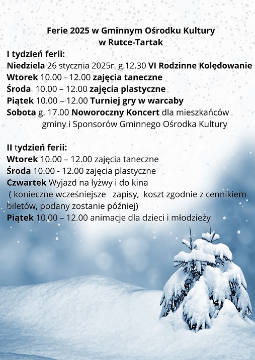 Na zajęcia plastyczne, taneczne, na turniej gry w warcaby oraz wspólne kolędowanie i koncert zaprasza w ferie Gminny Ośrodek Kultury w Rutce-Tartak. Dla najmłodszych zorganizowany zostanie również wyjazd na łyżwy.