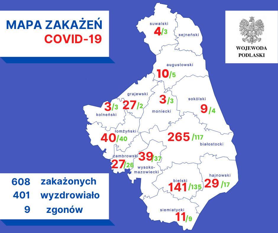 W sumie w województwie podlaskim mamy 608 potwierdzonych przypadków zakażenia SARS-CoV-2.