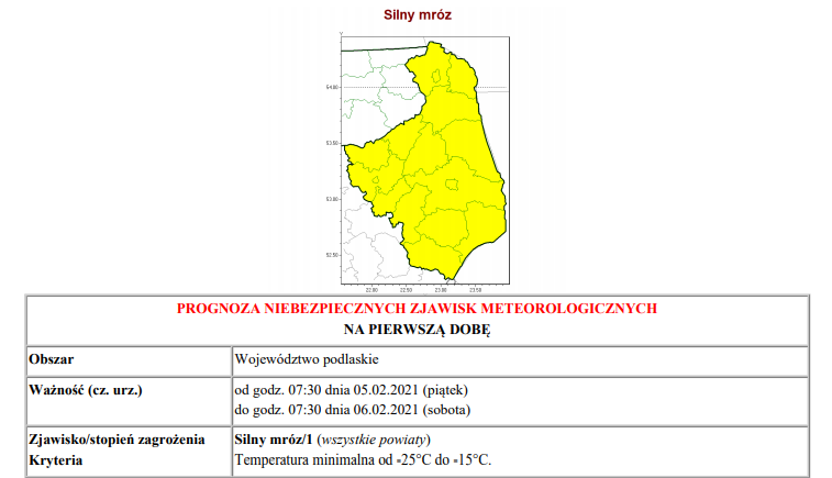 Ostrzeżenie ważne w SuwaÅ‚kach i powiecie suwalskim od godz. 20 w czwartek do piÄ…tku, do 9.00 rano gÅ‚osi, że prognozuje siÄ™ temperaturÄ™ minimalnÄ… w nocy miejscami od -17°C do -15°C i wiatr o Å›redniej prÄ™dkoÅ›ci od 10 km/h do 12 km/h.