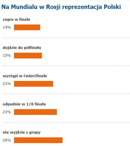 Aż 26 proc. gÅ‚osujÄ…cych jest przekonanych, że notowana dzisiaj na 8. miejscu w rankingu Å›wiatowym Polska na mistrzostwach w Rosji nie wyjdzie z grupy eliminacyjnej. Prawie drugie tyle wieszczy, że w grupie, w której rywalizujemy z Senegalem, KolumbiÄ… i JaponiÄ…, zajmiemy 1. lub. 2. miejsce, ale odpadniemy już w pierwszym meczu fazy pucharowej, w której zmierzymy siÄ™ najprawdopodobniej z Niemcami lub BelgiÄ….