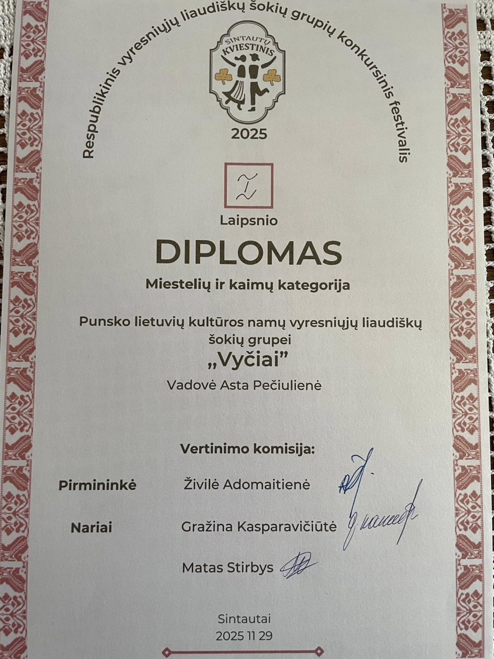 Starszy zespół taneczny z Domu Kultury Litewskiej w Puńsku „Vyčiai” zdobył tam I miejsce w kategorii miasteczek i wsi.