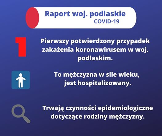 Jak informuje poranny.pl, pacjentem "zero" w naszym województwie "jest mieszkający w Sobolewie (gmina Supraśl) Krzysztof Drabikowski, muzyk zespołu Batushka. Krzysztof Drabikowski koncertuje po całym świecie. Ostatnio grał w Lipsku w Niemczech, a na początku marca miał koncert w Londynie. Powiedział nam, że "czuje się nieźle", do tego stopnia, że pali regularnie papierosy! Mężczyzna leży w szpitalu zakaźnym w Białymstoku".