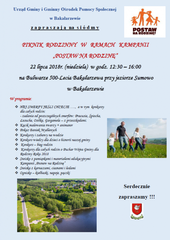 Urząd Gminy w Bakałarzewie oraz Gminny Ośrodek Pomocy Społecznej zapraszają na Piknik Rodzinny w Ramach Kampanii "Postaw na rodzinę". Piknik odbędzie się w niedzielę, 22 lipca, na Bulwarze 500-lecia Bakałarzewa nad jeziorem Sumowo. Początek o 12.30.