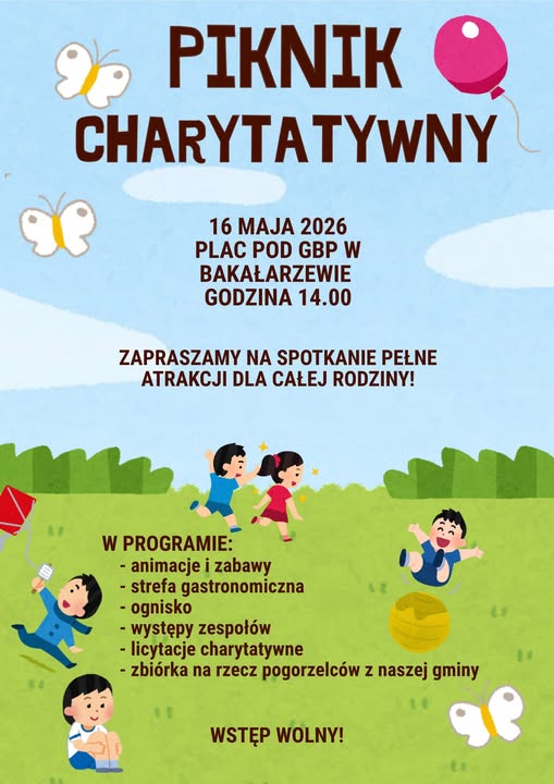 Piknik odbędzie się 16 maja na placu przed Gminną Biblioteką Publiczną w Bakałarzewie. Początek o 14.00. Wstęp wolny.