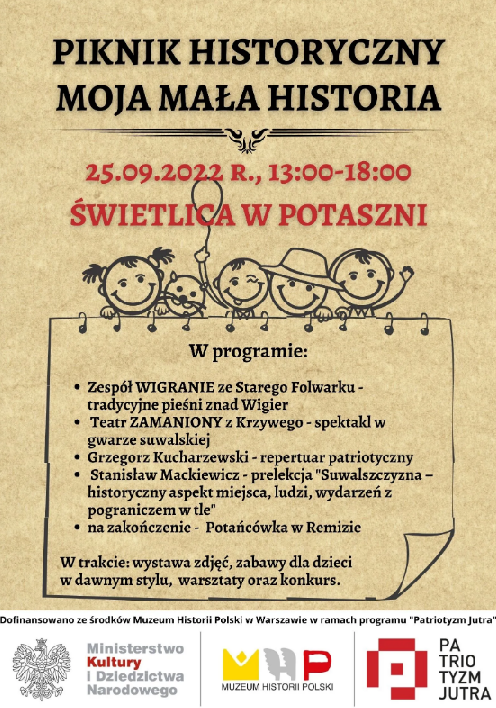 25 września 2022 r. (niedziela), Ośrodek Czytelnictwa i Kultury Gminy Suwałki zaprasza na boisko przy Świetlicy w Potaszni na Piknik Historyczny. Będzie on podsumowaniem projektu „Moja Mała Historia", który realizowano w tym roku dzięki dofinansowaniu ze środków Muzeum Historii Polski w Warszawie i programowi „Patriotyzm Jutra".