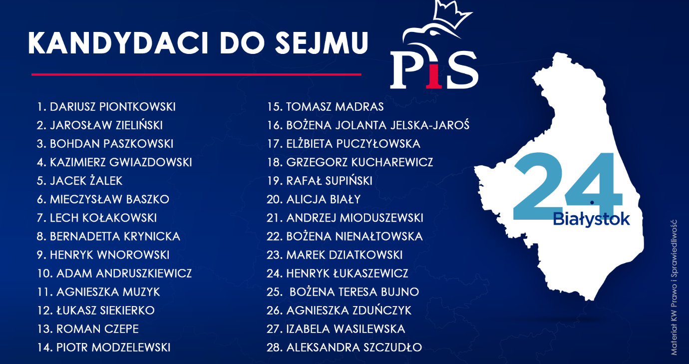 PiS jest pierwszym ugrupowaniem, które przedstawiło kompletną, składającą się z 28 osób listę kandydatów. Nasz okręg w Sejmie będzie reprezentowało 14 osób. Cztery lata temu PiS zdobyło 8 mandatów, Platforma Obywatelska - 3, a po jednym Nowoczesna, Kukiz 15 i PSL. W trakcie kadencji Krzysztof Truskolaski z Nowoczesnej przeszedł do klubu Platformy, a Adam Andruszkiewicz z Kukiz i Mieszysław Baszko z PSL do PiS-u. Teraz dwaj ostatni startują już pod szyldem PiSu.