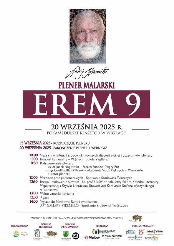 W dniach 15-20 września w Pokamedulskim Klasztorze na Wigrach, odbędzie się Międzynarodowy Plener Malarski EREM 9 im. prof. Andrzeja Strumiłło, połączony z wernisażem prac malarskich powstałych podczas pleneru.