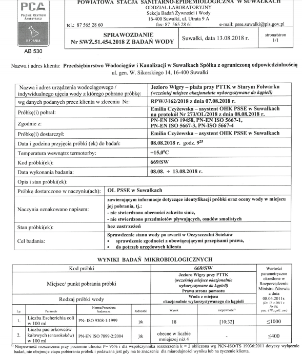 Próbki zostaÅ‚y zbadane przez PowiatowÄ… StacjÄ™ Sanitarno-EpidemiologicznÄ… w SuwaÅ‚kach 8 sierpnia. Wyniki badania otrzymaliÅ›my w dniu 13 sierpnia.
