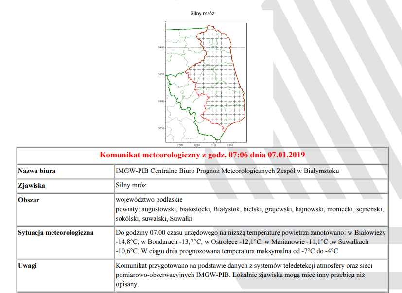 Za nami najzimniejsza, jak dotąd, tegoroczna noc. W naszym województwie na stacjach pomiarowych IMGW-PIB najniższą temperaturę, -14,8°C odnotowano w Białowieży. Termometr w Suwałkach pokazał -10,6°C.
