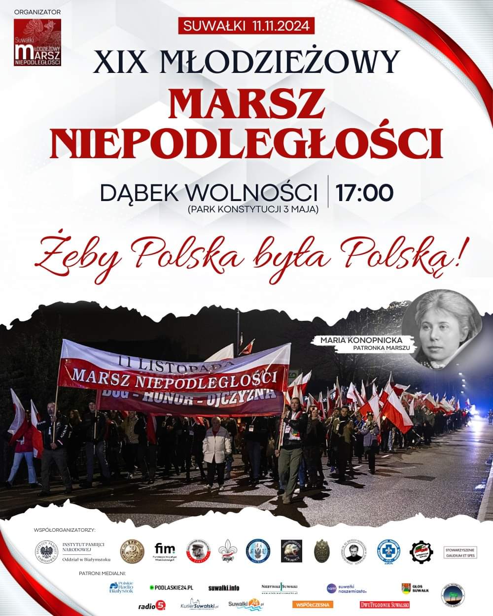 W poniedziałek 11 listopada już po raz dziewiętnasty w Suwałkach odbędzie się Młodzieżowy Marsz Niepodległości. Tym razem pod hasłem: „Żeby Polska była Polską!", a patronką Marszu będzie Maria Konopnicka. Przed uczestnikami kilka nowości i niespodzianek!