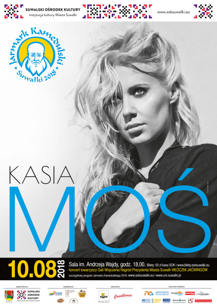 Tegoroczny Jarmark Kamedulski rozpoczynamy 10 sierpnia koncertem KASI MOŚ z zespołem. Pochodząca ze Śląska wokalistka to finalistka muzycznego show „Must be the music – tylko muzyka”. W ubiegłym roku reprezentowała Polskę w 62. konkursie Piosenki Eurowizji. Artystka ma na koncie współpracę takimi artystami, jak Kelly Osbourne, Mya, Carmen Electra, Eva Longoria, czy bliska suwalczanom Orkiestra AUKSO. W Suwałkach wystąpi z koncertem podczas tegorocznej Gali Włóczni Jaćwingów. Koncertowo będzie również na Dywaniku u Marii, gdzie zagra suwalski MUV.