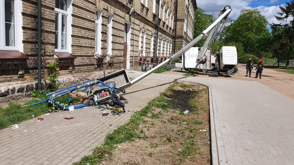 Dwaj mężczyźni w wieku 28 i 33 lat zostali ciężko ranni po tym, gdy samochód z podnośnikiem koszowym, przewrócił się na bok. Kosz z robotnikami uderzył o chodnik.
