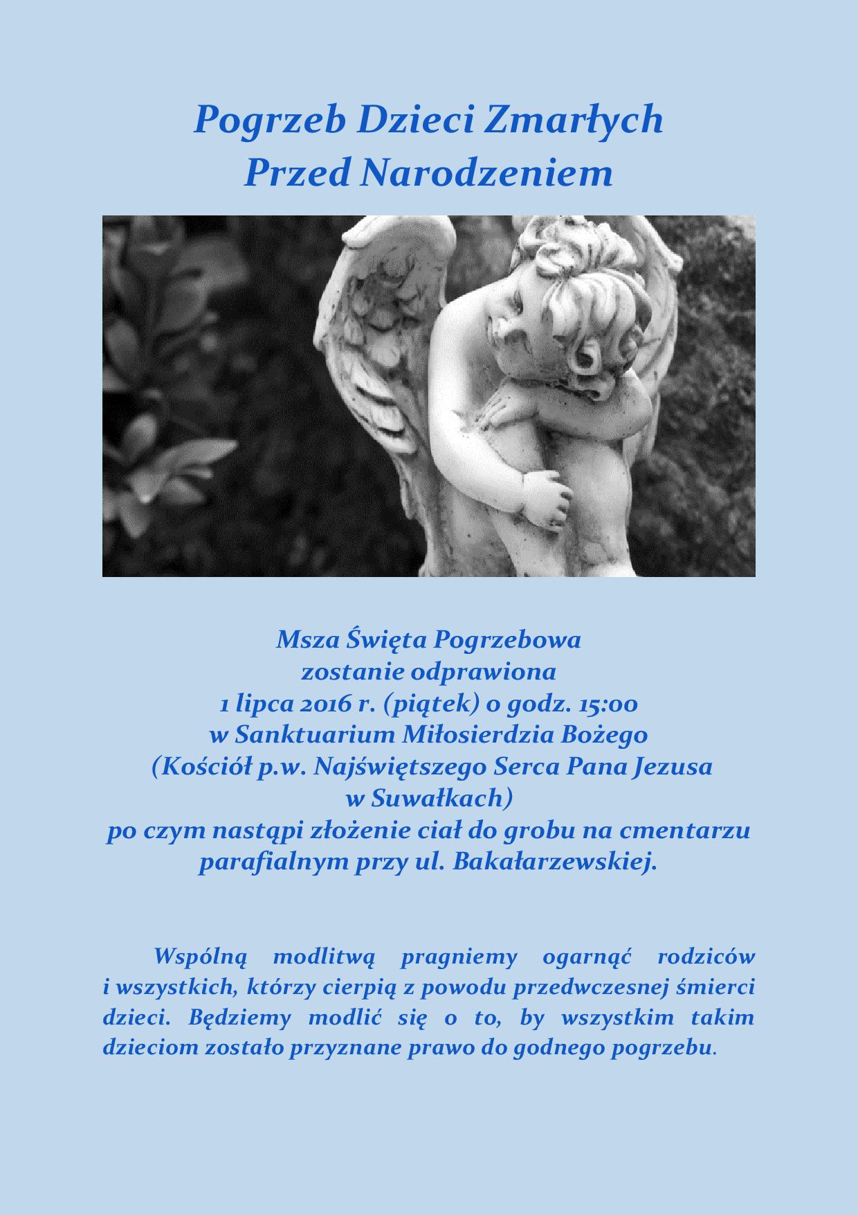 Miejski Ośrodek Pomocy Społecznej w Suwałkach informuje, że 1 lipca odbędzie się pogrzeb 17 dzieci zmarłych przed narodzeniem. O godzinie 15.00 w Kościele p. w. Najświętszego Serca Pana Jezusa w Suwałkach - Sanktuarium Miłosierdzia Bożego zostanie odprawiona msza święta w intencji dzieci zmarłych przed narodzeniem. Dalsze uroczystości pogrzebowe odbędą się na cmentarzu parafialnym przy ul. Bakałarzewskiej w Suwałkach.