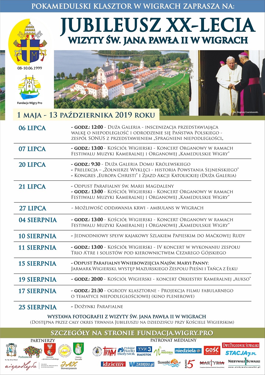 Już teraz, bo liczba miejsc jest ograniczona, Fundacja Wigry Pro oraz Gmina SuwaÅ‚ki, wspóÅ‚organizator imprezy, przyjmujÄ… zgÅ‚oszenia do udziaÅ‚u w wyznaczonym na sobotÄ™, 10 sierpnia spÅ‚ywie kajakowym Szlakiem Papieskim „Tajemnice Zawierzenia”. Uczestnicy od godz. 10 bÄ™dÄ… zwiedzać Dom Królewski i KaplicÄ™ KanclerskÄ…, o godz. 11 wezmÄ… udziaÅ‚ w Mszy Å›w. na kajakach, a w samo poÅ‚udnie wypÅ‚ynÄ… w trasÄ™ z Wigier do Maćkowej Rudy. Tam miejscowi parafianie podejmÄ… kajakarzy agapÄ….