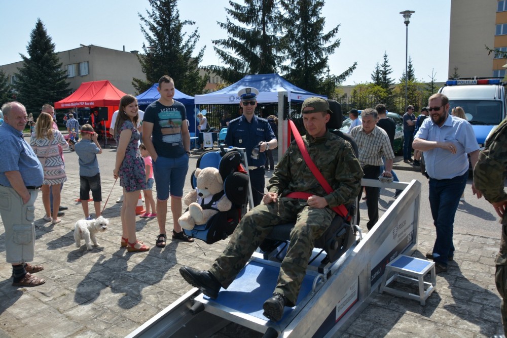 - symulatorem zderzeń- przypomniano o obowiązku korzystania z pasów bezpieczeństwa. Urządzenie składa się z fotela, który jedzie po równi pochyłej, rozpędza się do niewielkiej prędkości i nagle zatrzymuje się symulując zderzenie,