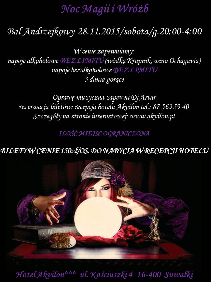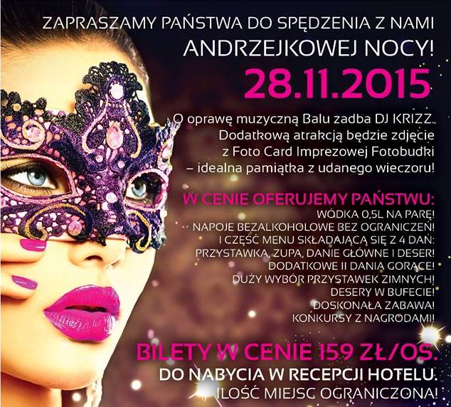 Podczas imprezy 30% rabat na alkohole. Wszyscy uczestnicy Balu Andrzejkowego będą mogli skorzystać ze specjalnej oferty noclegowej: pokój 2-osobowy ze śniadaniem i parkingiem w cenie 200 zł . W menu : trzy dania serwowane na gorąco, różnorodne przekąski, napoje zimne i gorące, bufet słodki, owoce sezonowe. Koszt Balu Andrzejkowego: 300 zł/ para. Zaproszenia i rezerwacje: Tel. +48 504 467 467