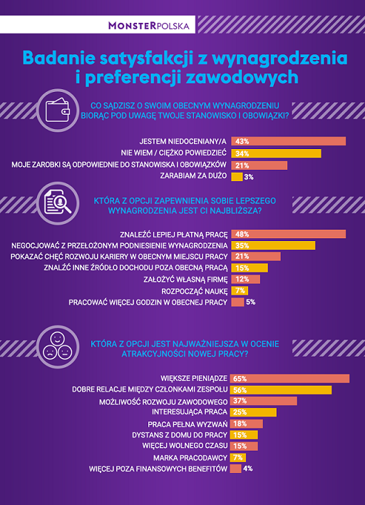 - Szukając odpowiedzi na te pytania, pracownicy często analizują ankiety płacowe, które pomagają określić ich aktualną wartość rynkową w odniesieniu do ich obecnej lub przyszłej pracy. Poza tym szukają informacji o pracodawcy na jego stronie internetowej, w mediach społecznościowych i wśród znajomych z branży – komentuje Pocheć z Monster Polska.pl.