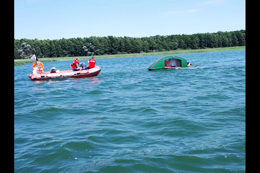 W tym samym czasie ratownicy z suwalskiego WOPR-u ruszyli z pomocÄ… zaÅ‚odze żaglówki, która siÄ™ wywróciÅ‚a niedaleko Plosa Wigierskiego. W rozmowie z żeglarzami policjanci ustalili, że zaskoczyÅ‚y ich zmienne warunki atmosferyczne. Próbowali wrócić do brzegu, jednak silny wiatr i napierajÄ…ca na nich fala zniosÅ‚a ich w trzcinowisko. Po udzieleniu pomocy 12- latkowi i jego dorosÅ‚ym towarzyszom policjanci ruszyli na pomoc żeglarzom z omegi. Na miejscu byli już ratownicy suwalskiego WOPR-u, którzy wyciÄ…gnÄ™li z wody kobietÄ™. W jeziorze pÅ‚ywaÅ‚o jeszcze dwóch mężczyzn, ale twierdzili, że nie potrzebujÄ… pomocy. Na szczęście 72-latek z SuwaÅ‚k i dwoje 64-latków z Nowego Dworu Mazowieckiego mieli zaÅ‚ożone kamizelki asekuracyjne. Policjanci z ratownikami przywiÄ…zali żaglówkÄ™ do Å‚odzi motorowych i jÄ… postawili, a nastÄ™pnie wylali z niej wodÄ™. Ostatecznie zaÅ‚oga zostaÅ‚a bezpiecznie odholowana do brzegu. TuryÅ›ci, dzielÄ…c siÄ™ swoimi wrażeniami z wywrotki, przyznali, że mimo dużego doÅ›wiadczenia w żeglowaniu zaskoczyÅ‚y ich warunki pogodowe.