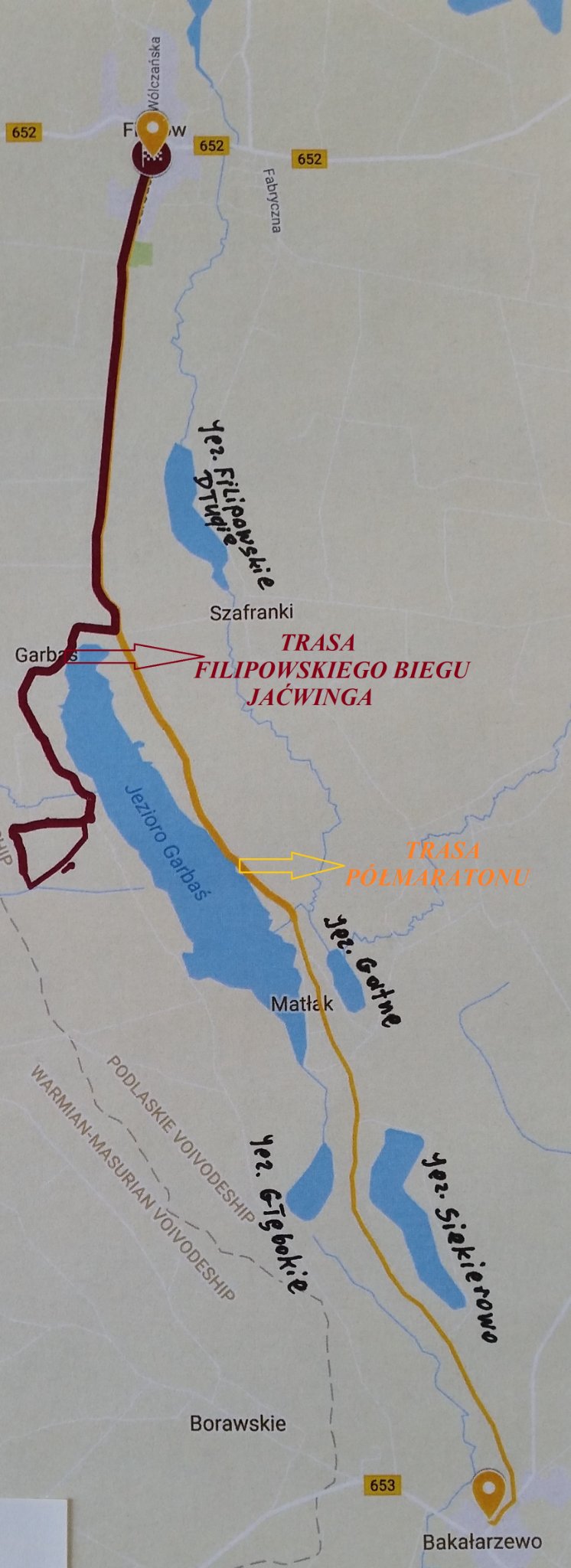 Licząca 21,0975 km trasa Półmaratonu Dolina Rospudy prowadzi asfaltową drogą z Filipowa do Bakałarzewa i z powrotem. Uczestnicy Filipowskiego Biegu Jaćwinga na 12,5 km pobiegną natomiast wzdłuż linii brzegowej jeziora Garbaś, przez tereny leśne i malowniczy mostek nad rzeką Rospuda.