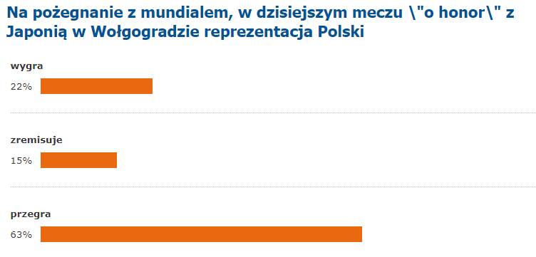 Postawa BiaÅ‚o-Czerwonych w meczach z Senegalem i KolumbiÄ… tak zdegustowaÅ‚a naszych Czytelników i odebraÅ‚a im wiarÄ™, że prawie dwie trzecie postawiÅ‚o w naszej sondzie na ich kolejnÄ… porażkÄ™.