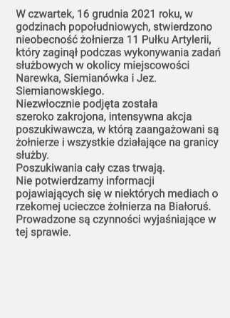 16. Pomorska Dywizja Zmechanizowana poinformowała, że w czwartek wieczorem zaginał żołnierz 11. Mazurskiego Pułku Artylerii w Węgorzewie. Białoruski Komitet Graniczny podaje, że to 25-letni Emil Czeczko, który przekroczył granicę i ubiega się o azyl polityczny na Białorusi.
