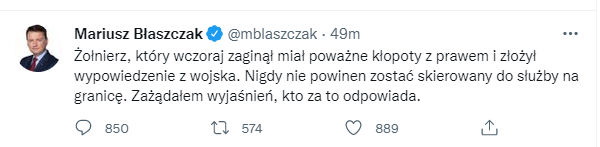 - Å»oÅ‚nierz, który wczoraj zaginÄ…Å‚ miaÅ‚ poważne kÅ‚opoty z prawem i zÅ‚ożyÅ‚ wypowiedzenie z wojska. Nigdy nie powinien zostać skierowany do sÅ‚użby na granicÄ™. ZażądaÅ‚em wyjaÅ›nieÅ„, kto za to odpowiada - skomentowal na Twitterze Mariusz BÅ‚aszczak.
