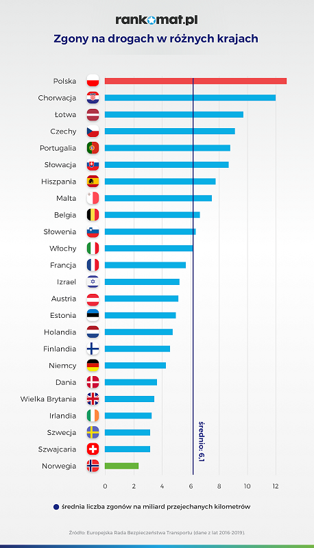 Pod tym wzglÄ™dem ponownie najbezpieczniejszym krajem w raporcie jest Norwegia, w której na drogach Å›mierć ponosi Å›rednio 20 osób na 1 mln mieszkaÅ„ców. W czoÅ‚ówce znalazÅ‚y siÄ™ również Szwecja i Szwajcaria (Å›rednio 22 zgony).