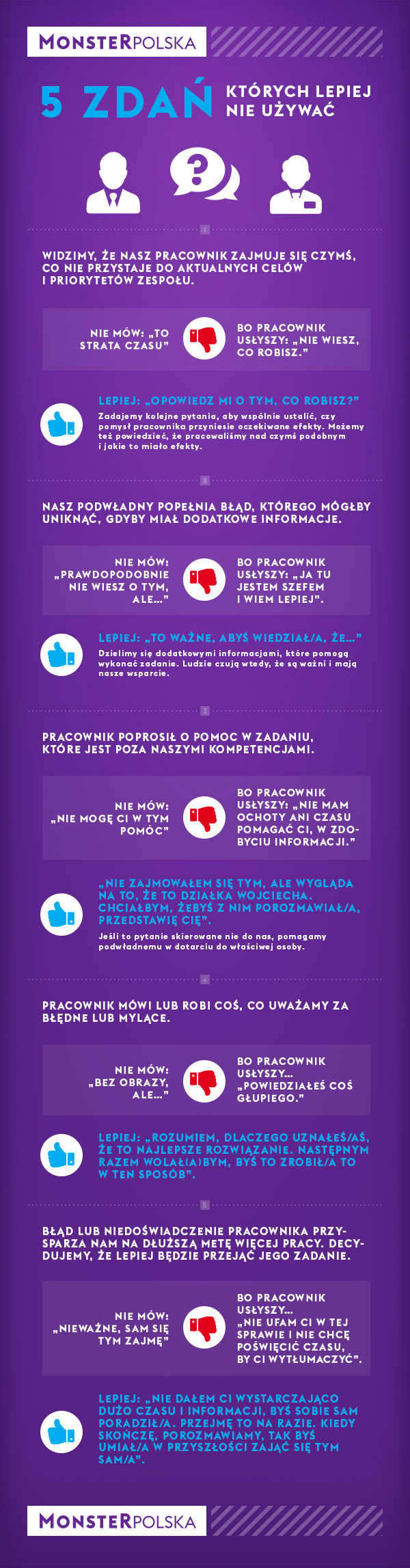 Lepiej: JeÅ›li to pytanie skierowane nie do nas, pomagamy podwÅ‚adnemu w dotarciu do wÅ‚aÅ›ciwej osoby. Mówimy np. „nie zajmowaÅ‚em siÄ™ tym, ale wyglÄ…da na to, że to dziaÅ‚ka Wojciecha. ChciaÅ‚bym, żebyÅ› z nim porozmawiaÅ‚, przedstawiÄ™ ciÄ™”.
