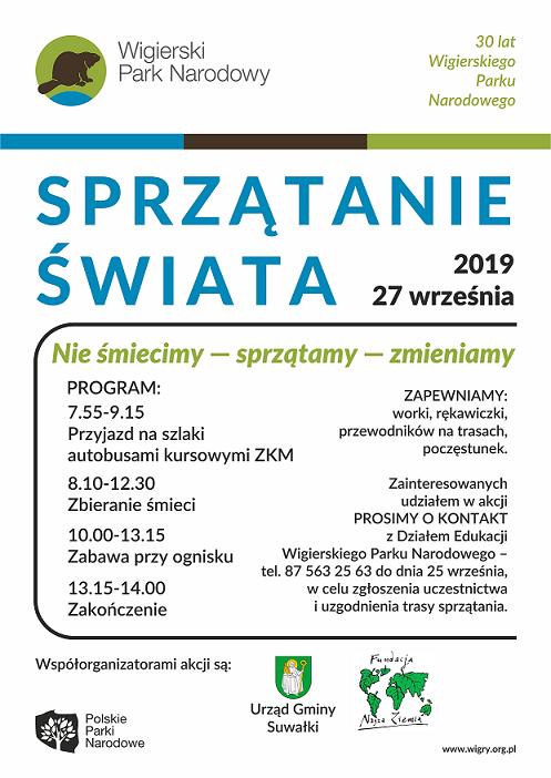 Wigierski Park Narodowy organizuje już 26. rok akcję „Sprzątania Świata". W dniu 27 września br. będziemy sprzątać śmieci na obszarze parku. Zaplanowano sprzątanie turystycznych szlaków wędrówek pieszych i rowerowych, szczególnie plaż, brzegów jezior i rzek.