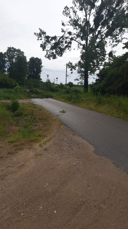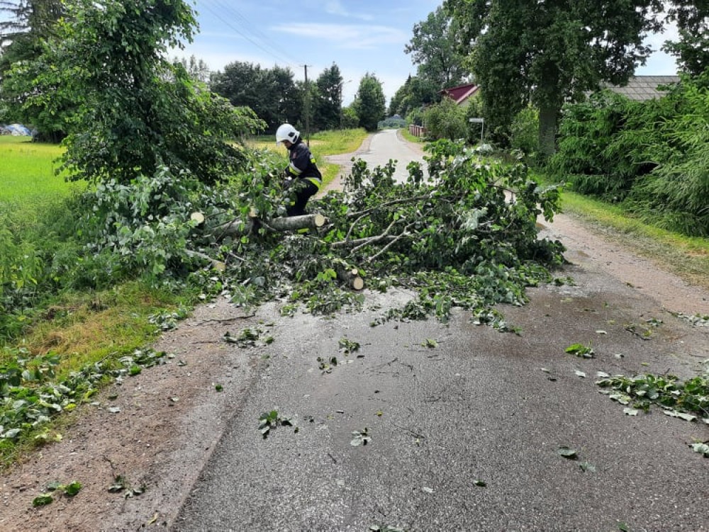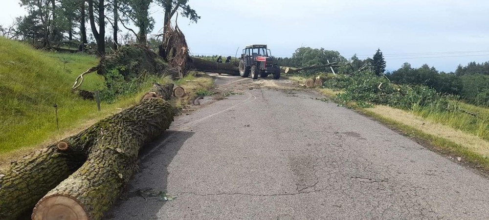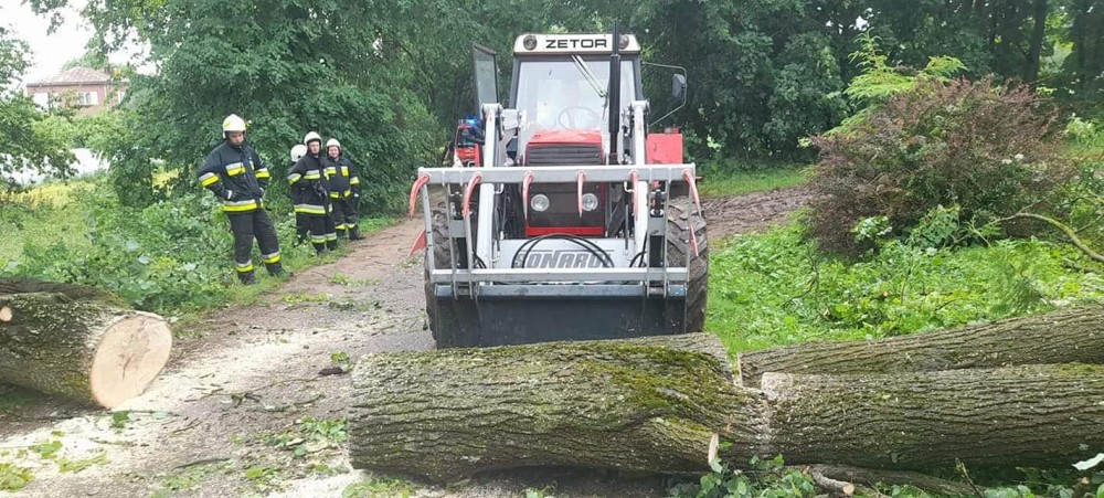 W usuwaniu skutków burzy w gminie Szypliszki strażakom pomagali rolnicy, którzy za pomocÄ… ciÄ…gników Å›ciÄ…gali ciężkie konary z jezdni.