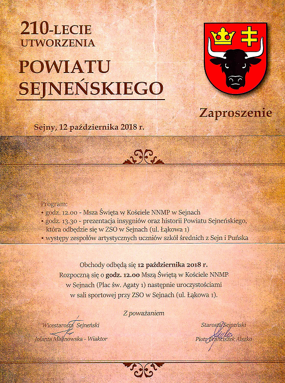 Starostwo powiatowe organizuje w najbliższy piątek, 12 października uroczystości z okazji 210-lecia powiatu sejneńskiego.