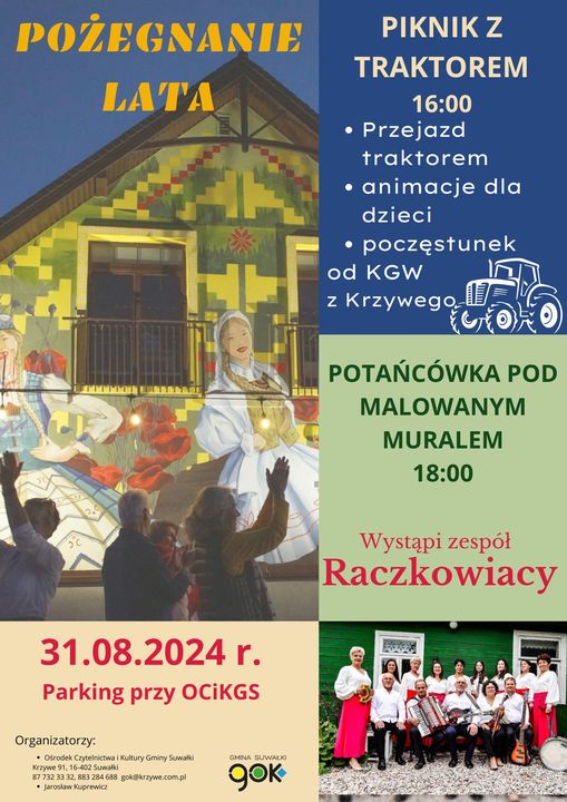 Na wspólne pożegnanie lata zaprasza do Krzywego Ośrodek Czytelnictwa i Kultury Gminy Suwałki. W programie piknik z traktorem, animacje dla dzieci, poczęstunek przygotowany przez Koła Gospodyń Wiejskich Gminy Suwałki z siedzibą w Krzywem i potańcówka pod malowanym muralem