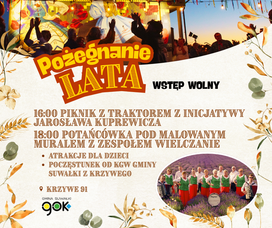 W programie: piknik z traktorem, potaÅ„cówka pod malowanym muralem z zespoÅ‚em Wielczanie, atrakcje dla dzieci, poczÄ™stunek od KoÅ‚a GospodyÅ„ Wiejskich Gminy SuwaÅ‚ki z Krzywego.