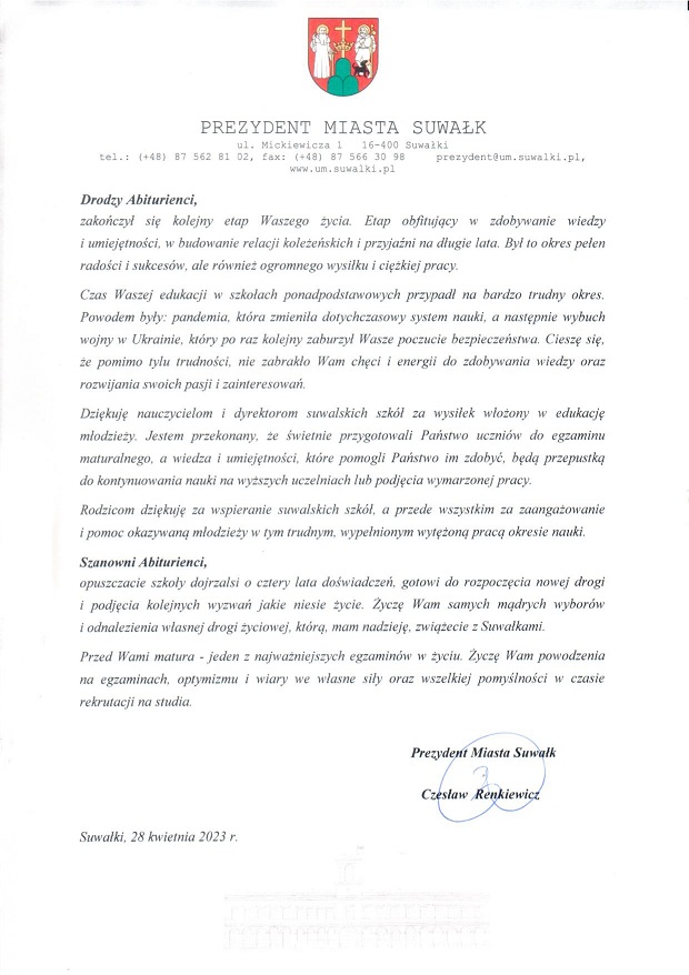 Dziś szkoły ponadpodstawowe, które prowadzi Miasto Suwałki, ukończyło 680 uczniów, w tym 412 licealistów i 268 uczniów technikum. Od 4 do 23 maja będą trwały matury. Z tej okazji Czesław Renkiewicz, Prezydent Suwałk przekazuje życzenia oraz podziękowania.