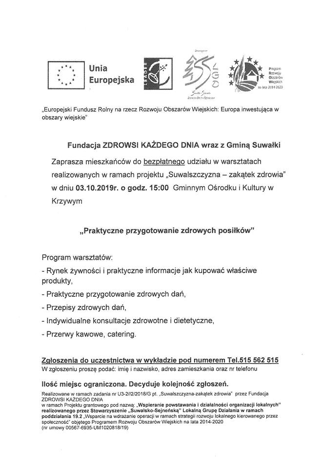 Fundacja Zdrowsi Każdego Dnia zaprasza wszystkich mieszkańców Gminy Suwałki do udziału w bezpłatnych warsztatach dotyczących zdrowego odżywiania.