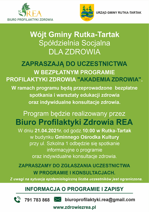 Urząd Gminy w Rutce-Tartak i Biuro Profilaktyki Zdrowia „Rea” zapraszają do udziału w programie profilaktyki zdrowia „Akademia zdrowia” Rea. Spotkanie informacyjne wraz z bezpłatna konsultacją odbędzie się 21 kwietnia.