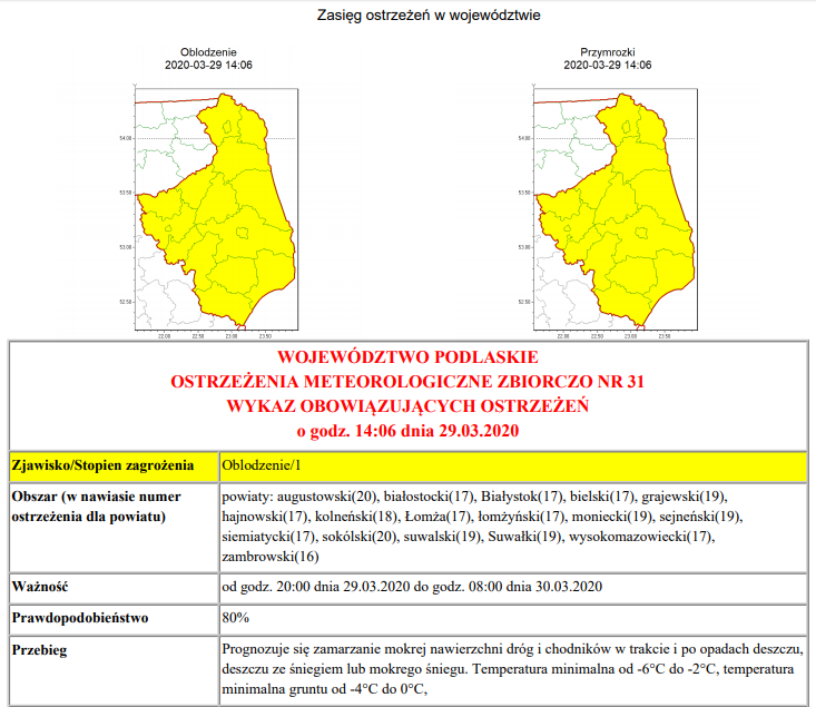 Biuro Prognoz Meteorologicznych IMGW-PIB w Białymstoku wydało ostrzeżenia o oblodzeniu oraz o przymrozkach w całym województwie. Obowiązuje ono do środy, 1 kwietnia, ale może być kontynuowane.