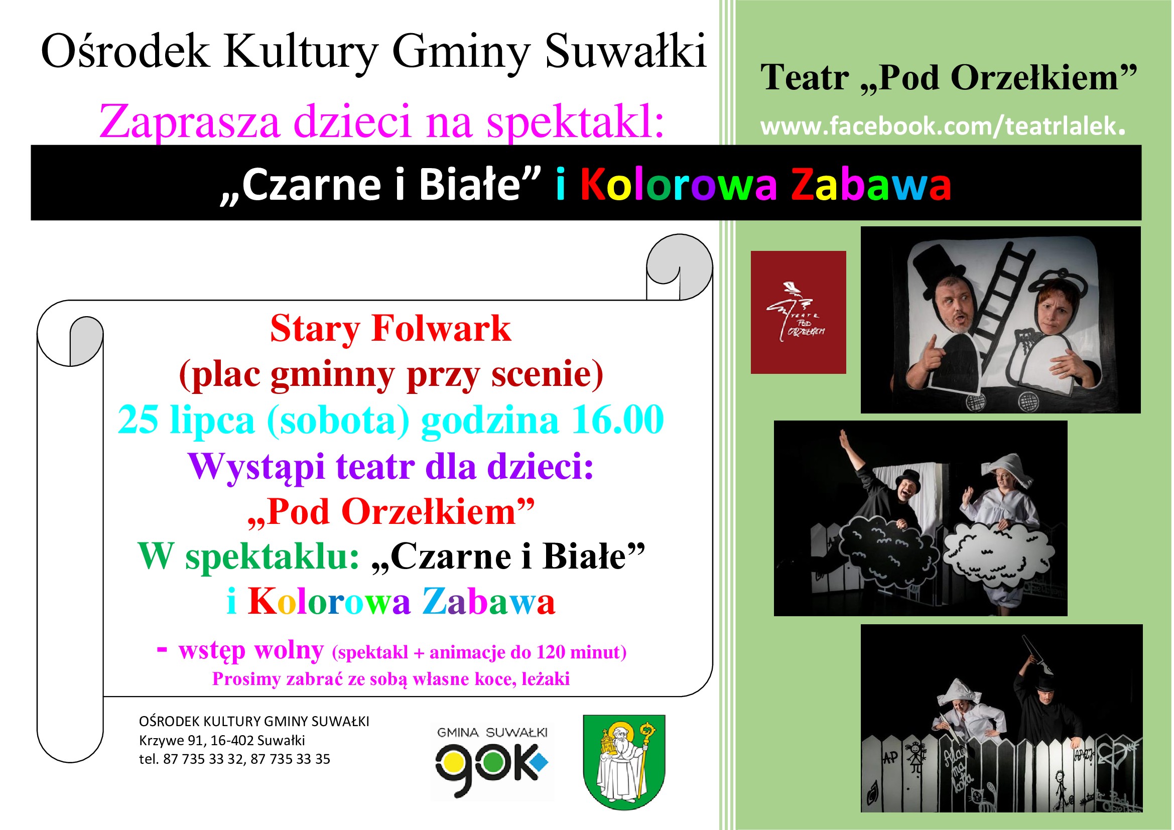 Ośrodek Kultury Gminy Suwałki serdecznie zaprasza dzieci i rodziców w sobotę, 25 lipca, o godzinie 16.00 do Starego Folwarku (plac gminny przy scenie). Wystąpi teatr dla dzieci: „Pod Orzełkiem" w spektaklu: „Czarne i Białe". Będzie też Kolorowa Zabawa .