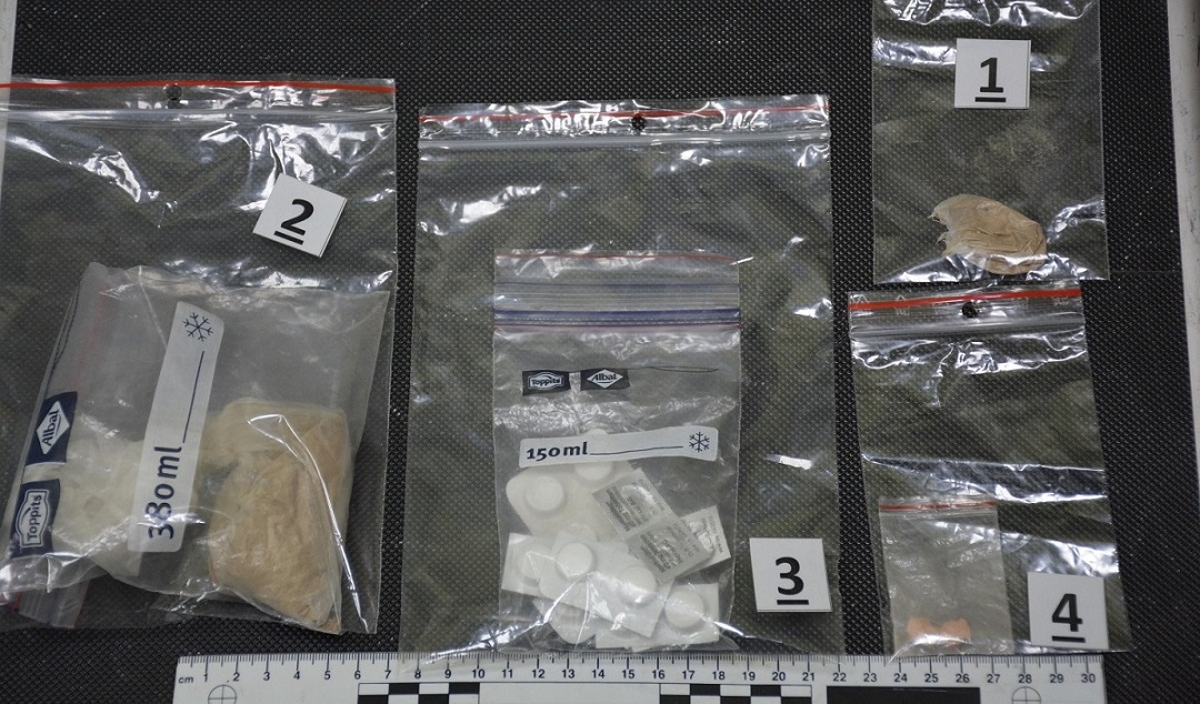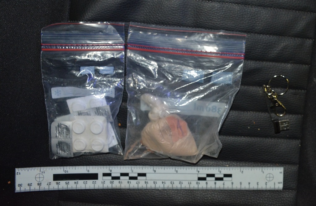 W kabinie samochodu miÄ™dzy innymi za popielniczkÄ…, pod plastikowÄ… osÅ‚onÄ… tunelu Å›rodkowego dźwigni zmiany biegów funkcjonariusze ujawnili opakowania z brÄ…zowym i biaÅ‚ym proszkiem oraz 19 tabletek. Tester narkotyczny wykazaÅ‚, że sÄ… to kokaina, amfetamina, metadon i ekstazy. Zabezpieczono: 80,49 gramów kokainy, 39,75 gramów amfetaminy, 17 tabletek metadonu i 2 tabletki ekstazy. Wartość ujawnionych narkotyków to ponad 14 tys. zÅ‚.