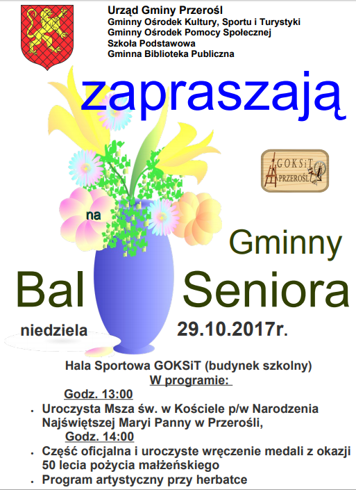 Urząd Gminy Przerośl wraz z Gminnym Ośrodkiem Kultury, Sportu i Turystyki, Gminnym Ośrodkiem Opieki Społecznej, Szkołą Podstawową i Gminną Biblioteką Publiczną zapraszają na doroczny Gminny Bal Seniora.