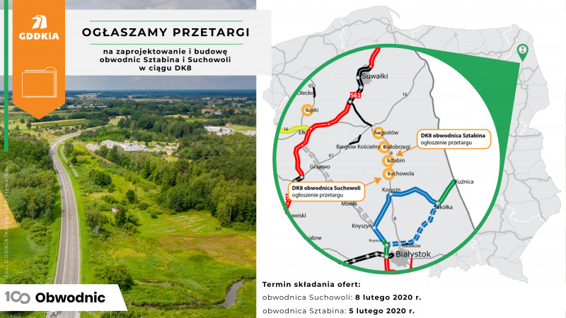 Generalna Dyrekcja Dróg Krajowych i Autostrad ogłosiła we wtorek, 29.12.2020 r. przetargi na projekt i budowę obwodnic Suchowoli oraz Sztabina w ciągu drogi krajowej nr 8.