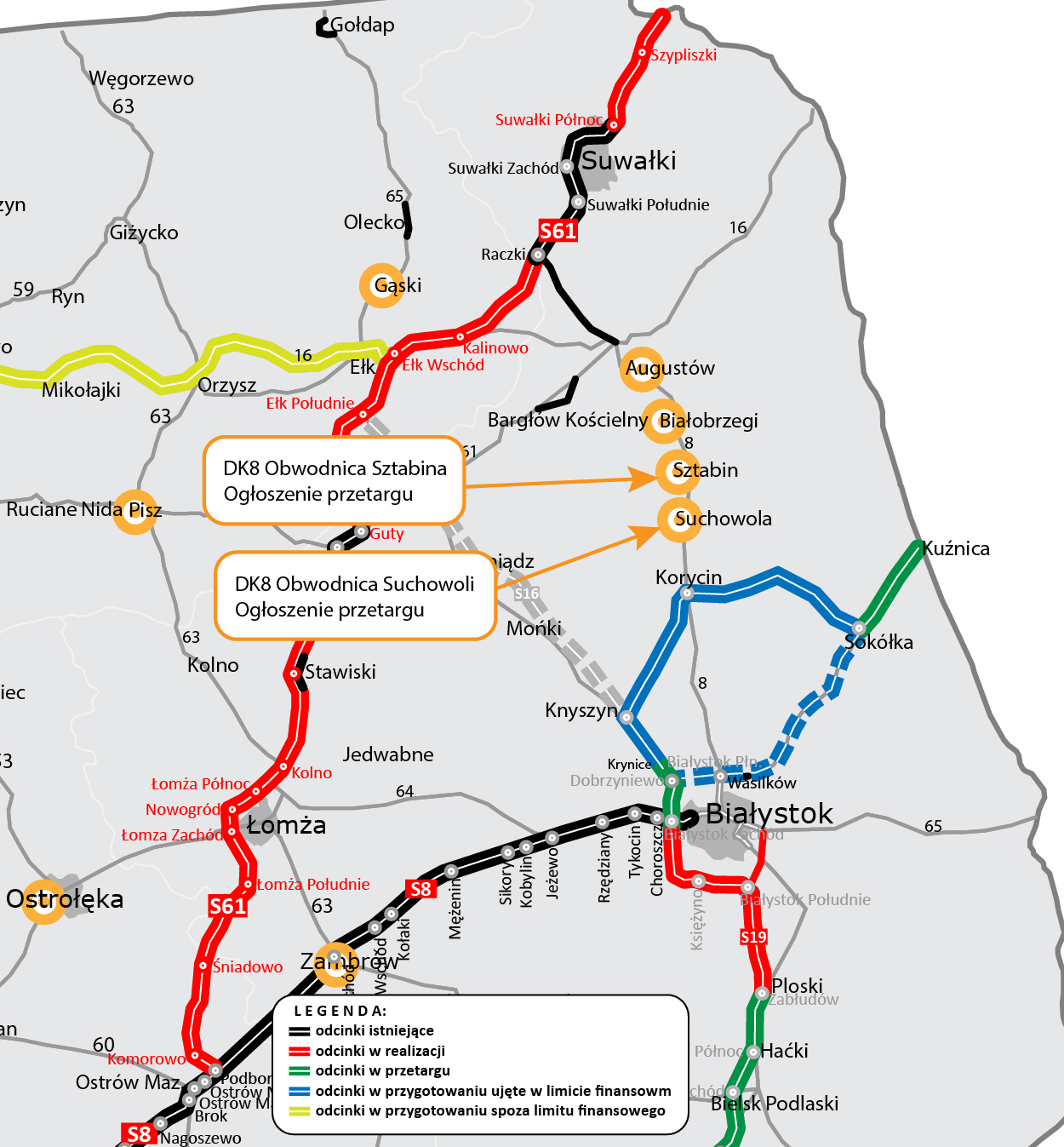 Budowa obwodnic Suchowoli i Sztabina ma kluczowe znaczenie dla poprawy pÅ‚ynnoÅ›ci i przepustowoÅ›ci ruchu tranzytowego w ciÄ…gu drogi krajowej nr 8, pomiÄ™dzy BiaÅ‚ymstokiem a Augustowem i obwodnicÄ… tego miasta, a także dalej - granicÄ… z LitwÄ… w Budzisku. Realizacja obu inwestycji poprawi bezpieczeÅ„stwo ruchu drogowego poprzez odseparowanie ruchu lokalnego (w tym pojazdów rolniczych) od ruchu tranzytowego. Ponadto obwodnice wyprowadzÄ… ruch tranzytowy poza miejscowoÅ›ci, co zdecydowanie poprawi warunki życia ich mieszkaÅ„ców.