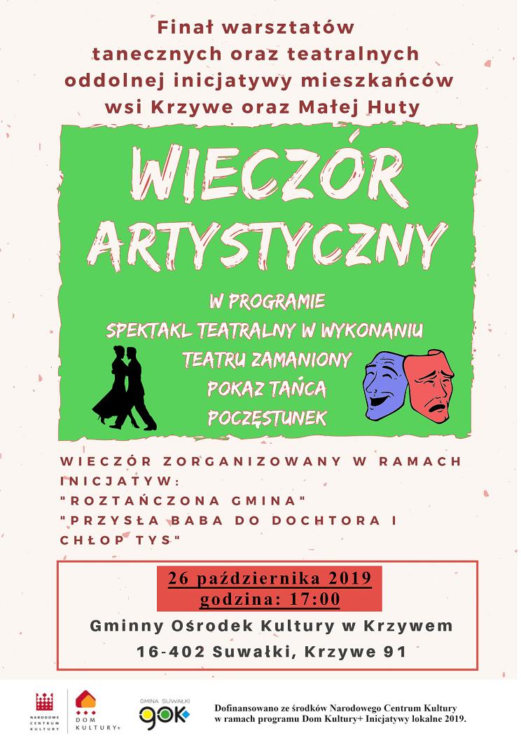 Mieszkańcy wsi Krzywe oraz Małej Huty zapraszają na „Wieczór artystyczny”. Wydarzenie jest organizowane dzięki inicjatywom oddolnym mieszkańców ww wsi pod nazwą: „Przysła baba do dochtora i chłop tys” oraz „Roztańczona Gmina”.